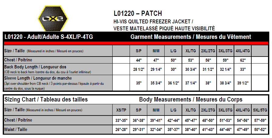 68 gsm – 2 oz./yd2 – 3.5 oz./lin. yd 100% polyester taffeta with wind resistant and water repellent finish. Insulation: 150 gsm 100% polyester.  Knit Collar and cuff. Two exterior side entry pockets and one inner patch pocket. Zocket embroidery access. YKK front zipper.  4” hi-vis contrast band with 2” reflective tape on front and back body and sleeves.  Meets CSA standards.